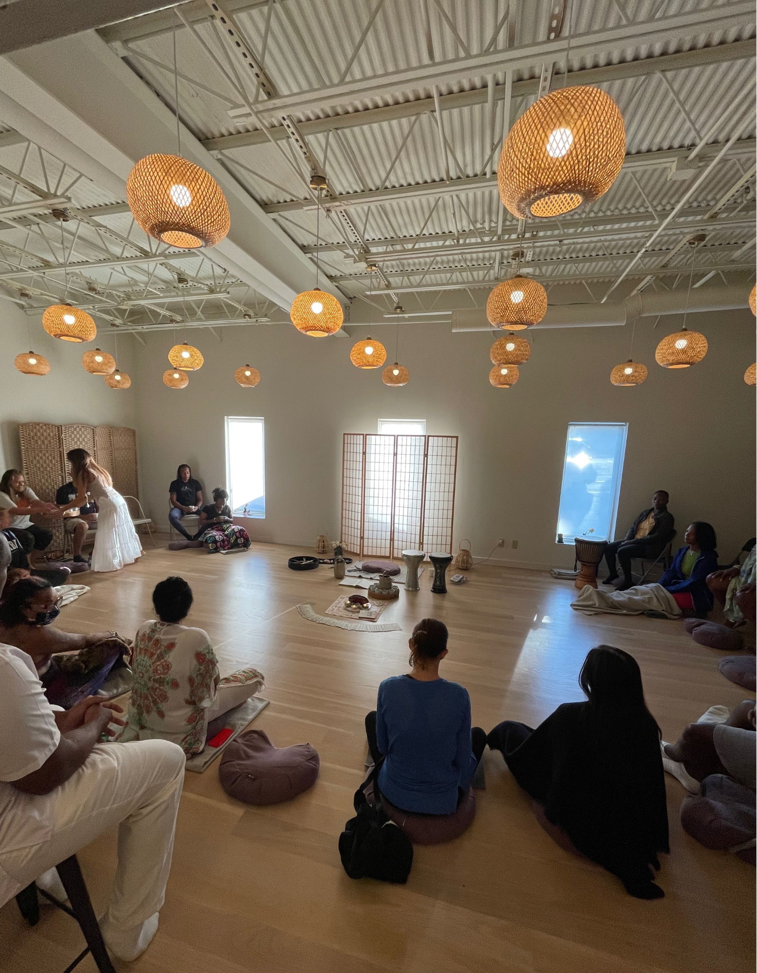 Room Description: Our Yoga Studio, located at the back of our center, is far away from the reception area to ensure students are able to practice yoga and meditate in a peaceful and soothing atmosphere. You are welcomed into the studio with three floor-to-ceiling windows: inviting the sun to illuminate the space or the moon to guide you in introspection during your practice. Each window features linen blinds, blocking visual noise if desired. Our studio flooring is Nordic white oak hardwood to provide grounding support during your practice while smooth to the touch. Additionally, the wall mirror creates an even more spacious experience.